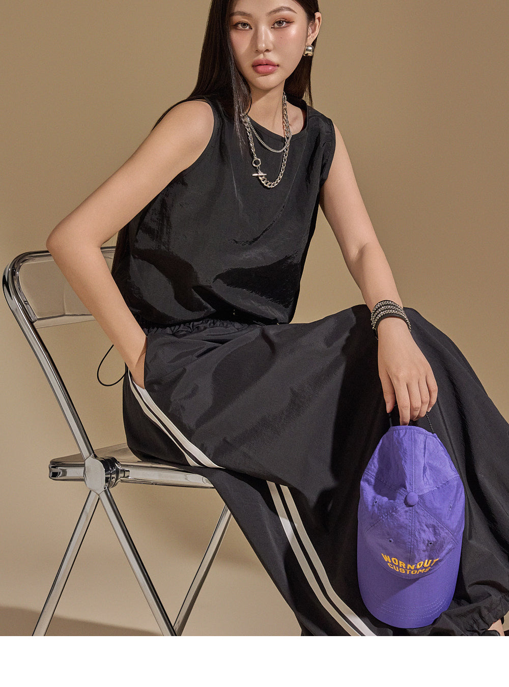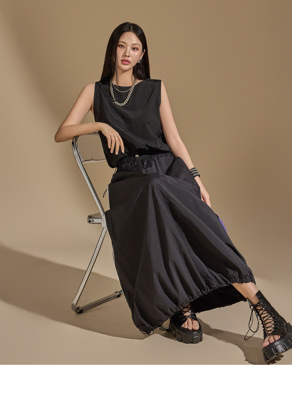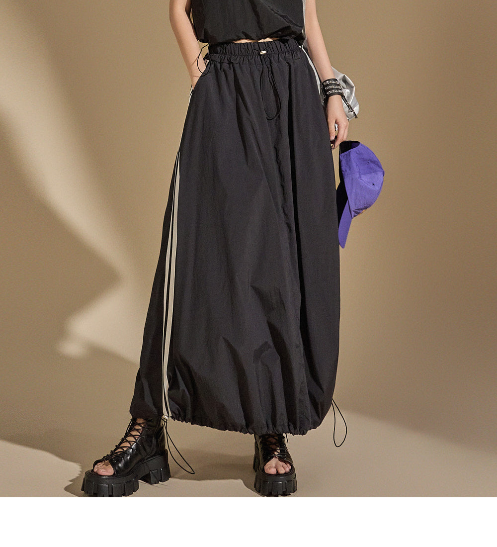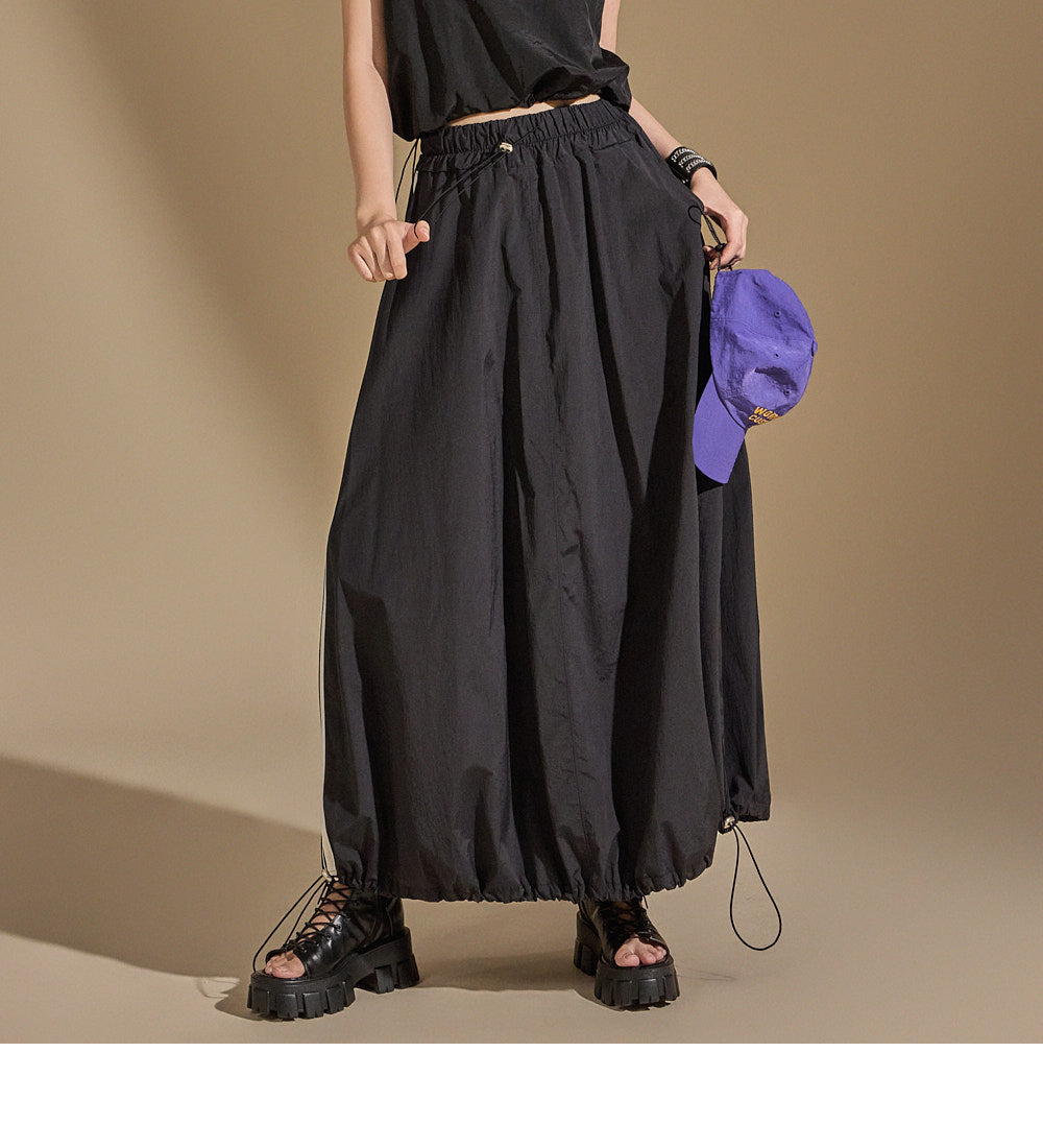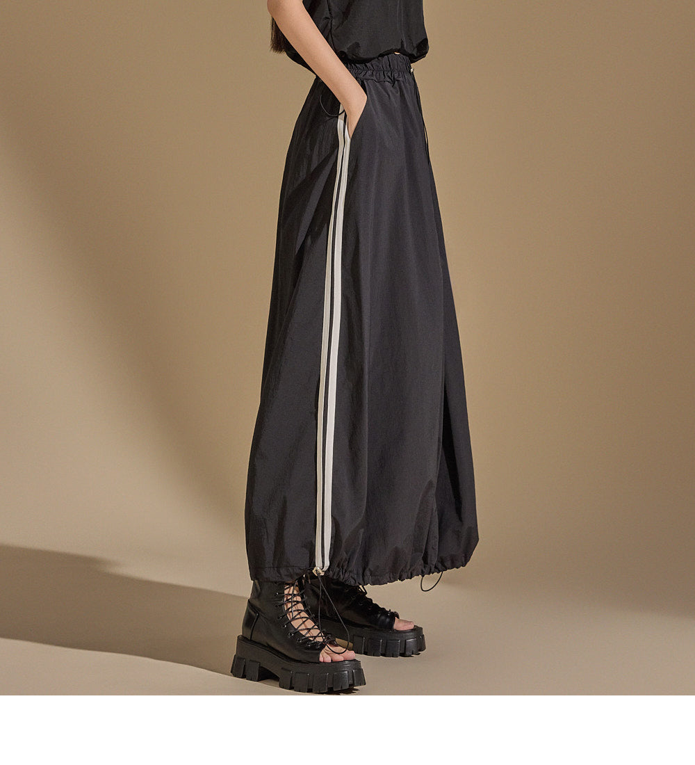 With an anorak-like texture, the skirt adds a stylish touch,