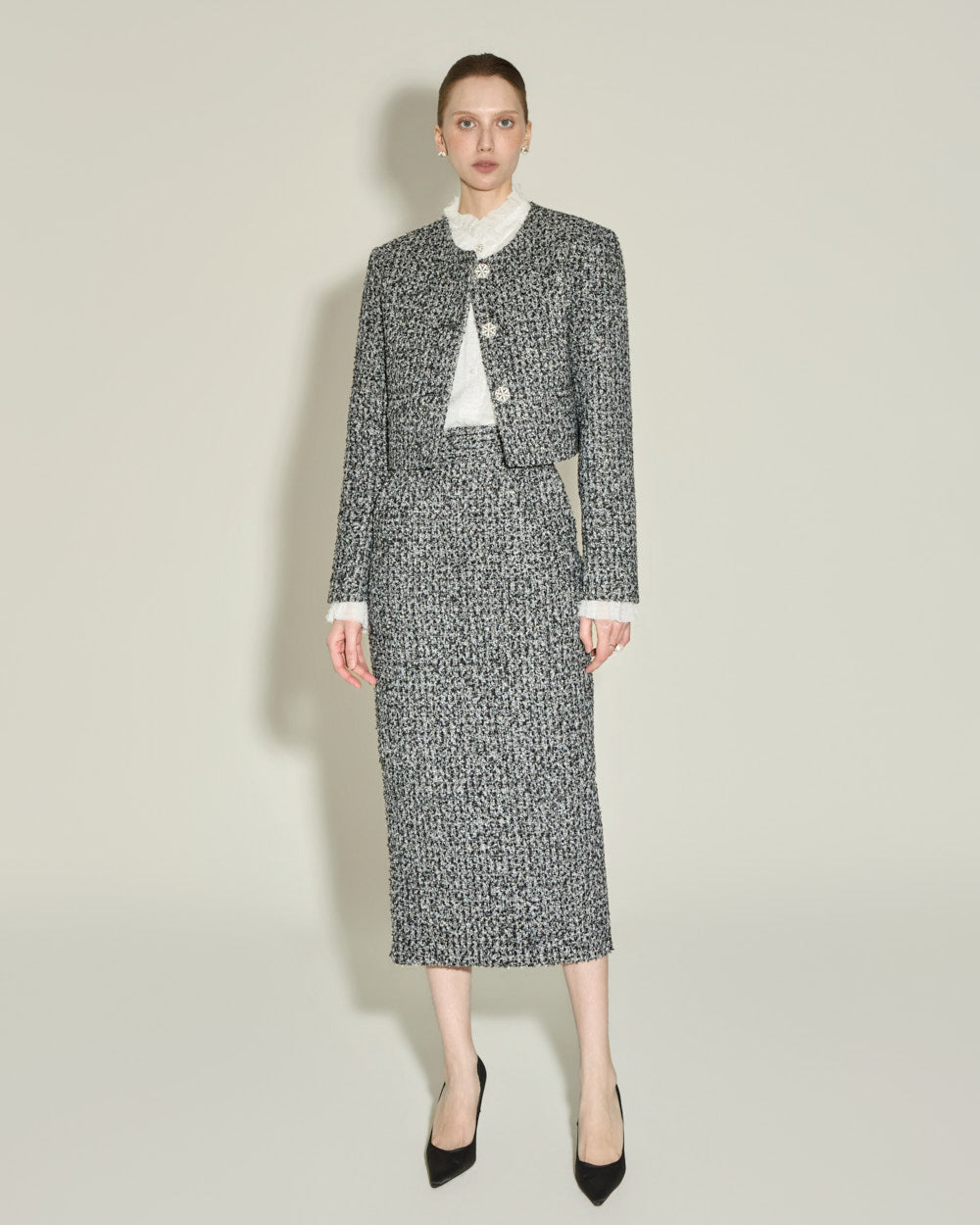This lovely tweed wool jacket and skirt set is a stylish addition.