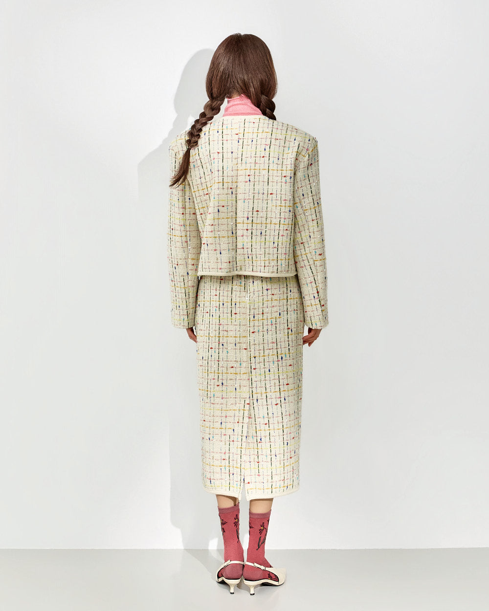 This tweed jacket and skirt set exudes a modern, casual vibe.