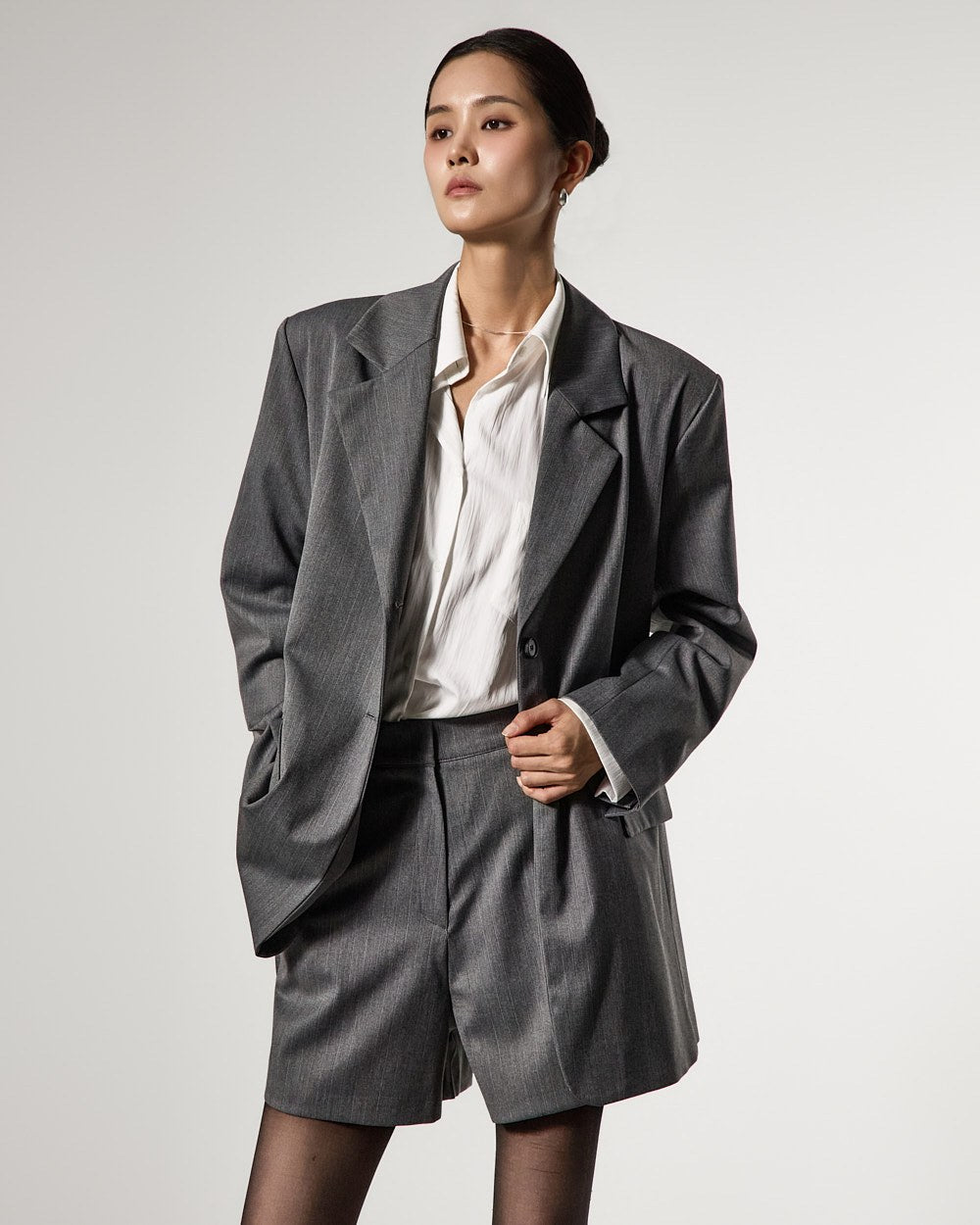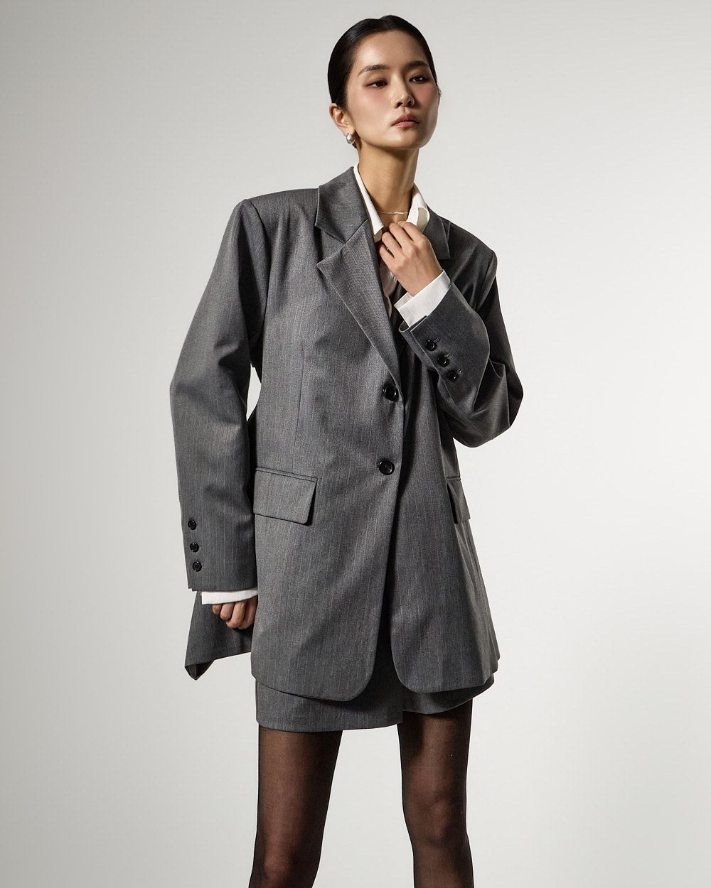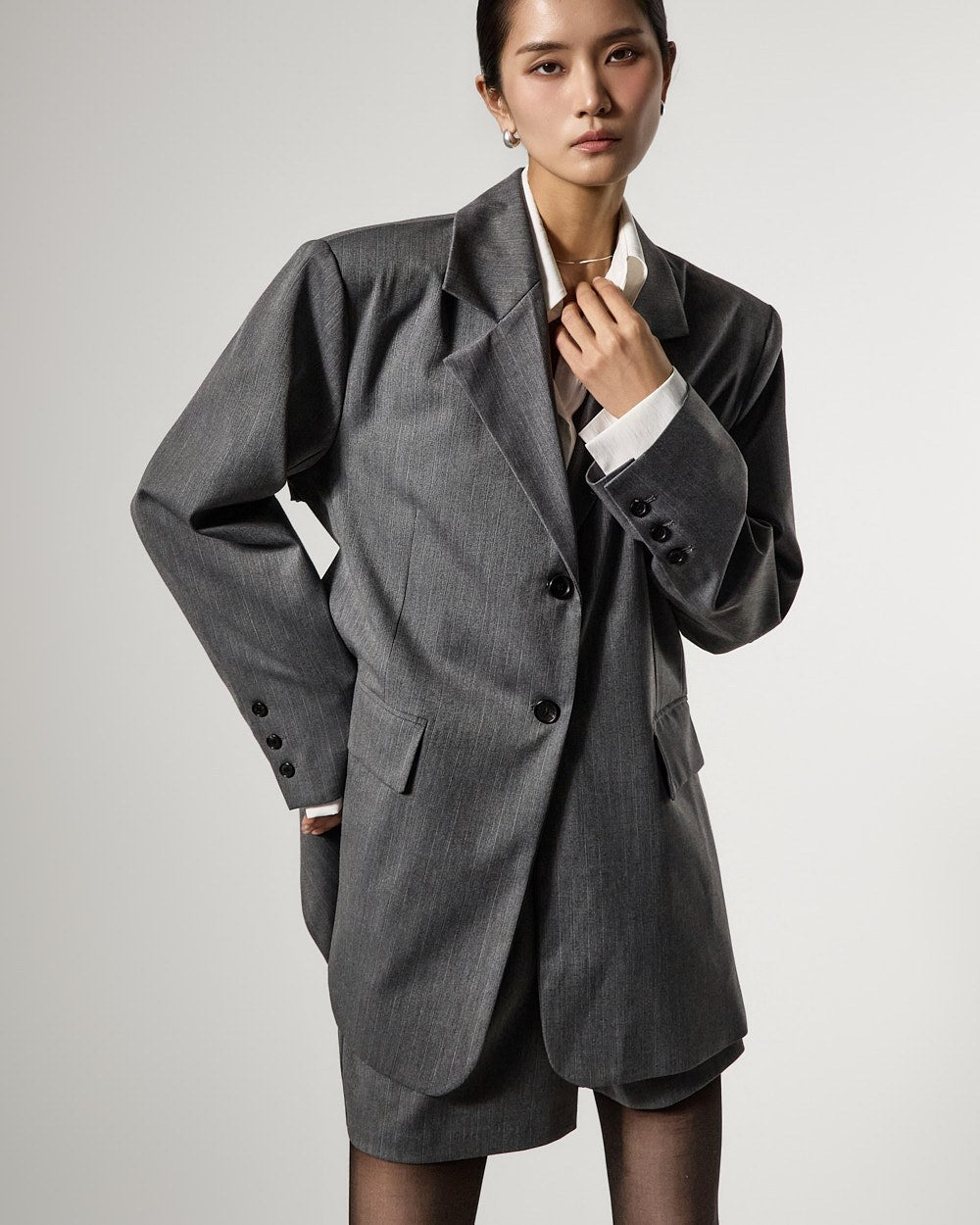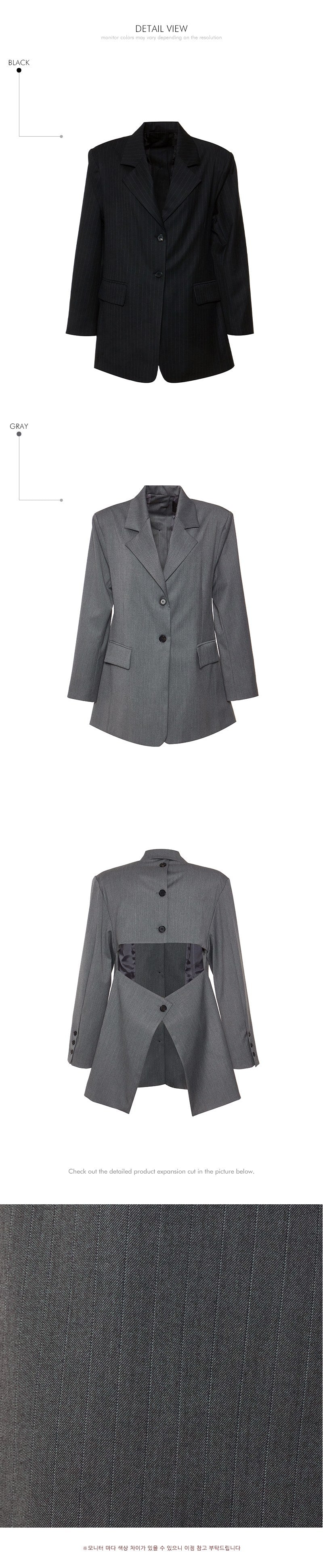 The jacket creates a sophisticated atmosphere with its oversized loose-fit silhouette and stripe pattern,