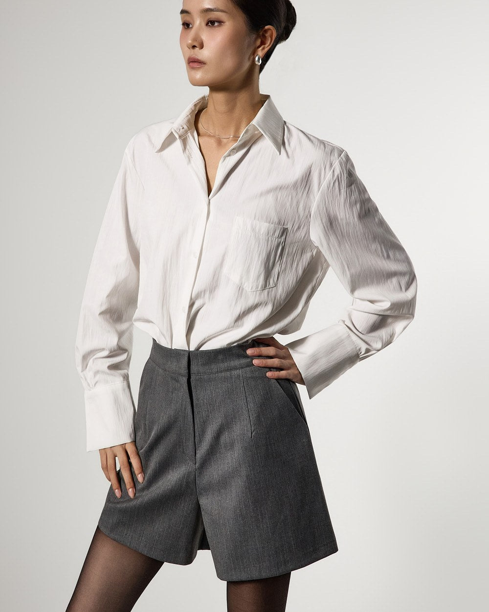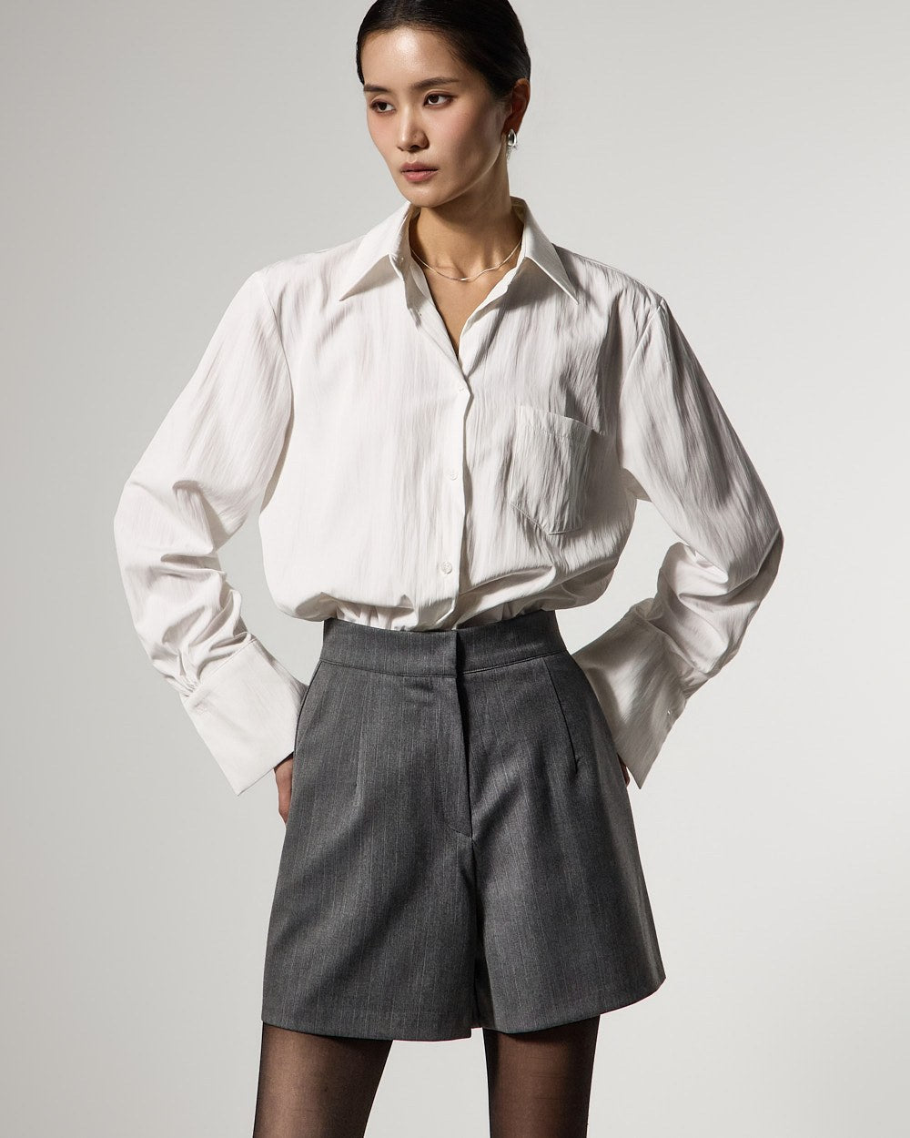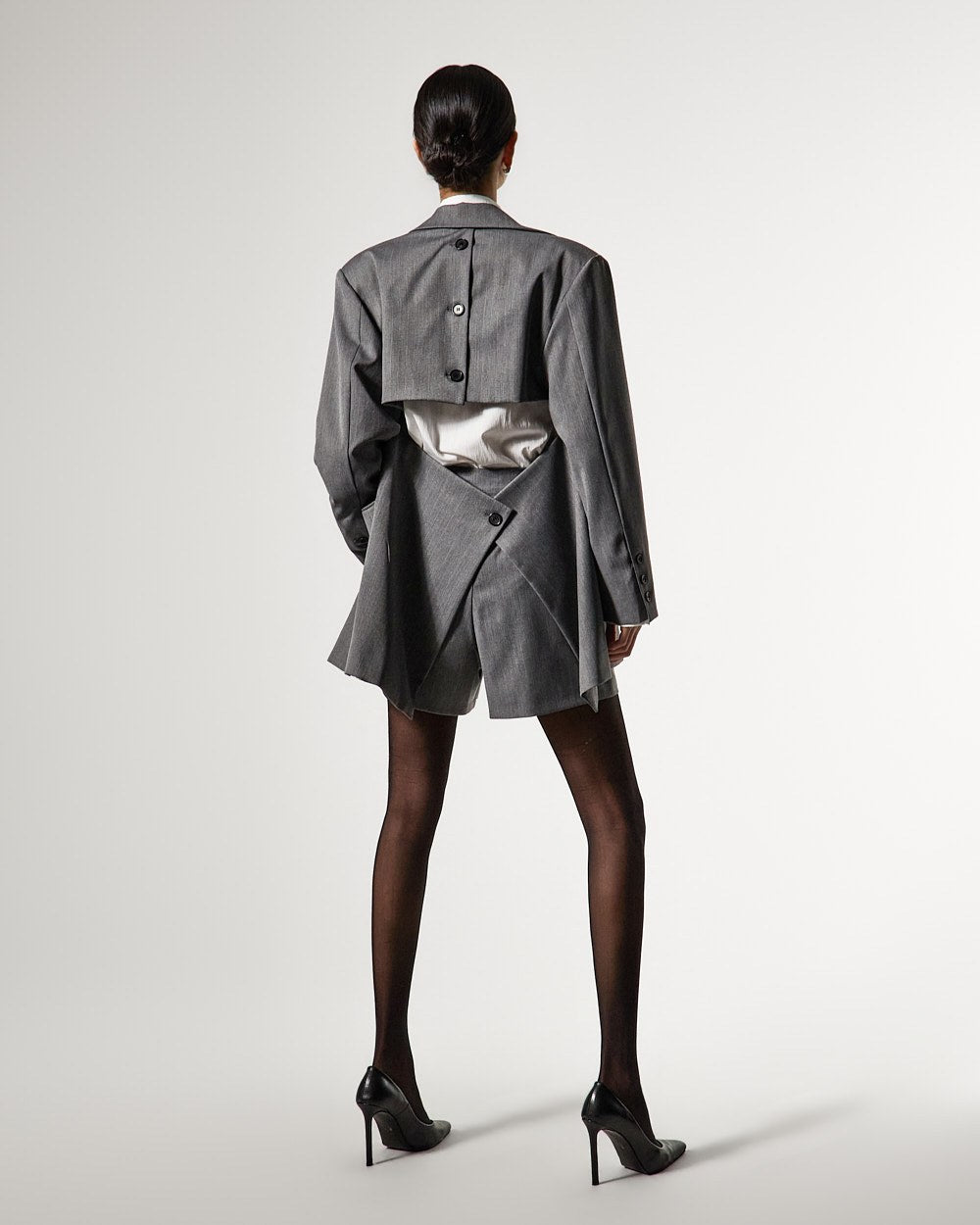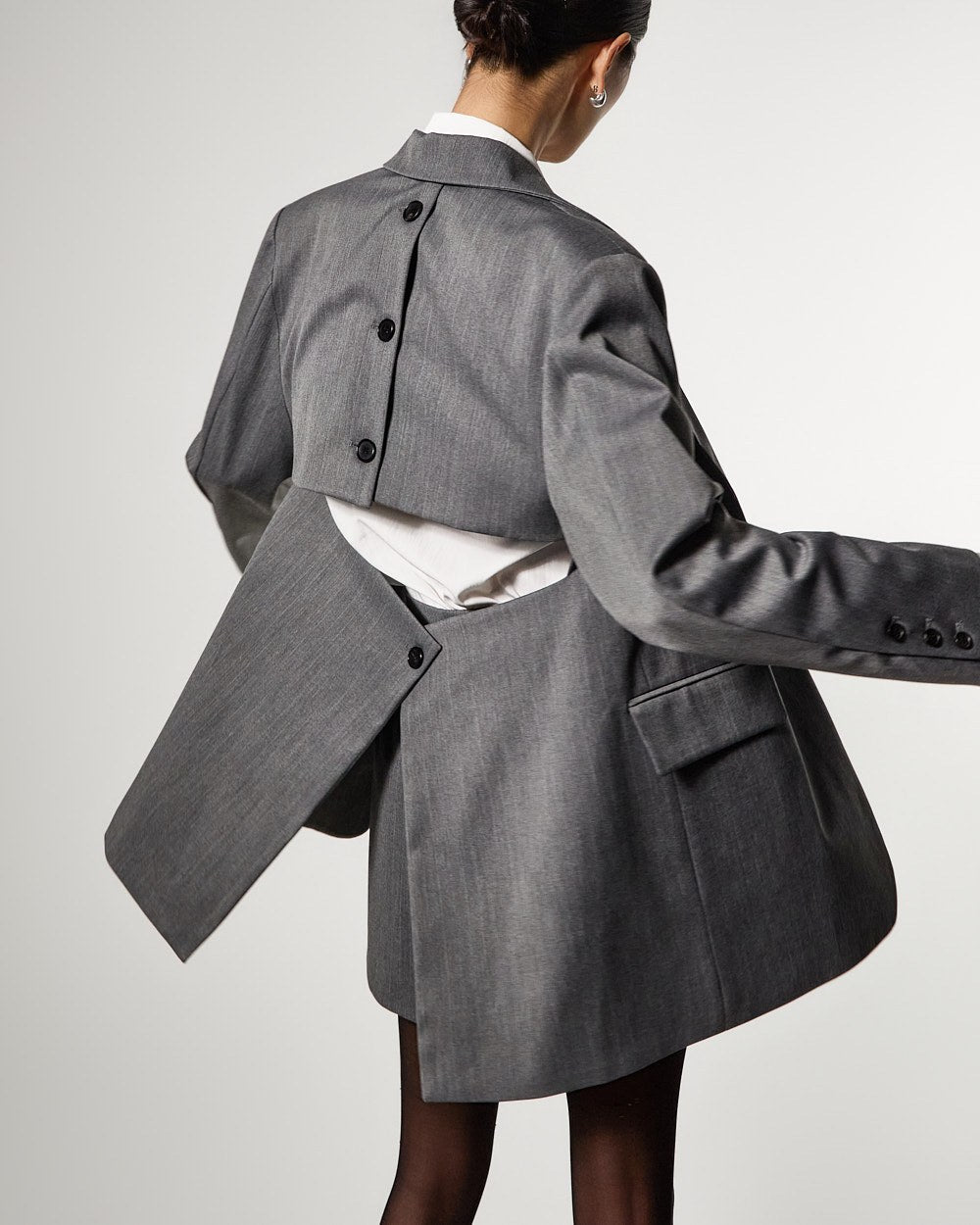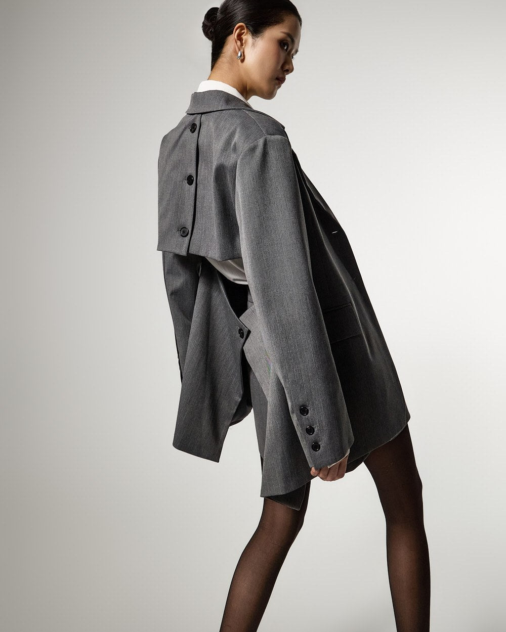 The jacket creates a sophisticated atmosphere with its oversized loose-fit silhouette and stripe pattern,
