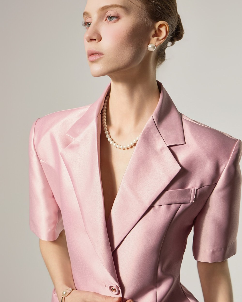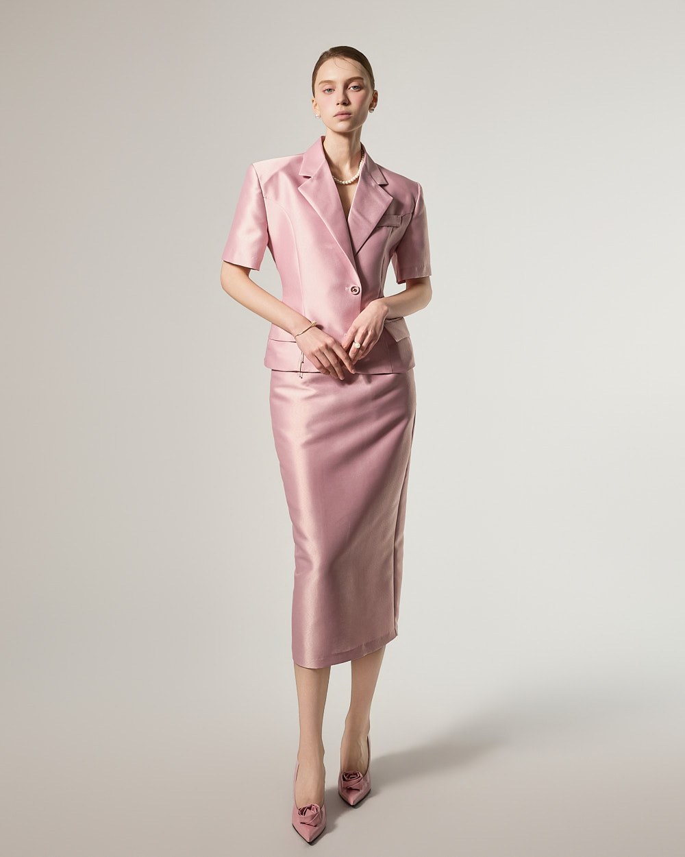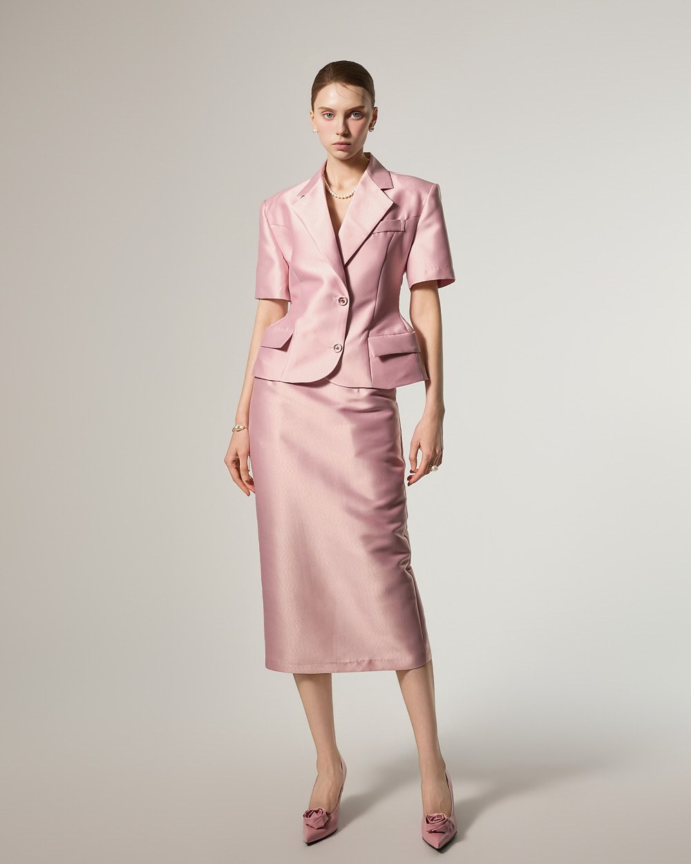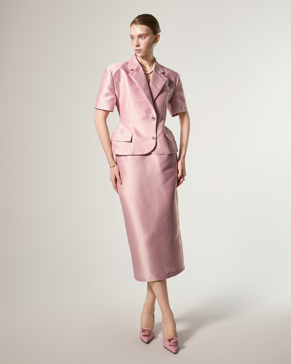 and its short-sleeved tailored design completes a clean and sophisticated look.
