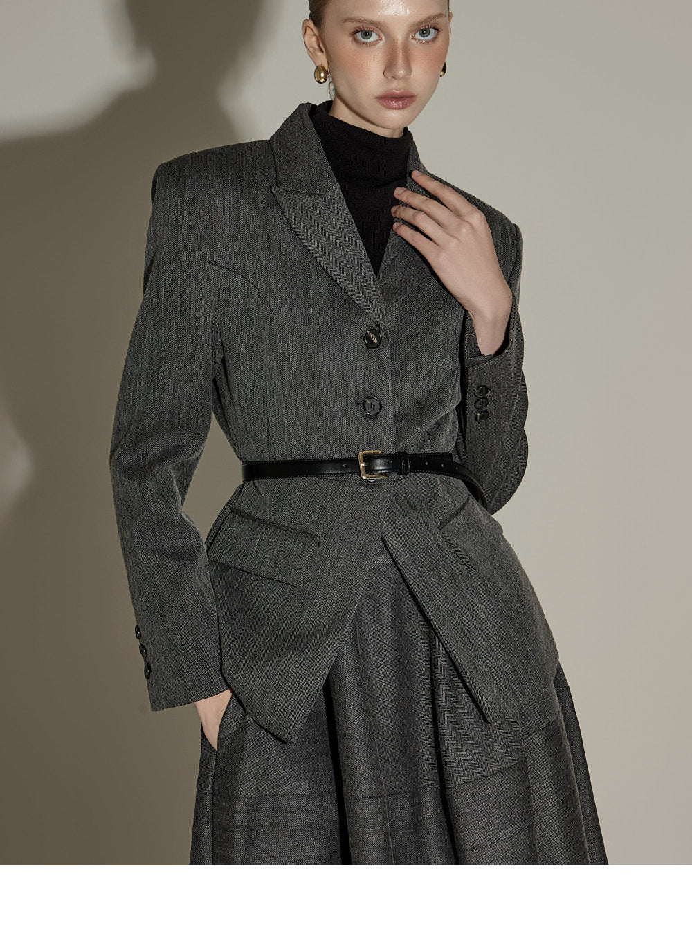 Model is 174cm tall and wears jacket and skirt in size S,